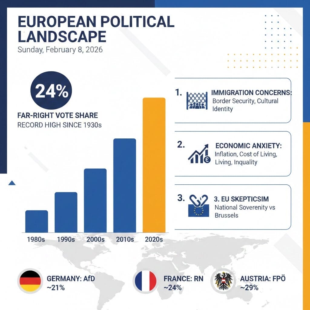 New analysis of electoral trends across the European continent reveals a significant shift in the political landscape, with far-right parties now commanding the largest average vote share in modern history. According to weighted election data, these parties have secured an average of 24% of the vote across European democracies. This figure represents the highest level of support for this segment of the political spectrum since the 1930s, marking a distinct departure from the post-war political consensus.