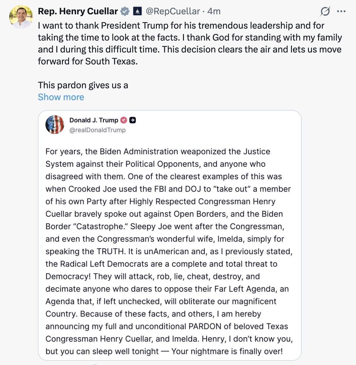 “Sleepy Joe went after the Congressman, and even the Congressman’s wonderful wife, Imelda, simply for speaking the TRUTH,” Trump stated. “I am hereby announcing my full and unconditional PARDON of beloved Texas Congressman Henry Cuellar, and Imelda. Henry, I don’t know you, but you can sleep well tonight — Your nightmare is finally over!”